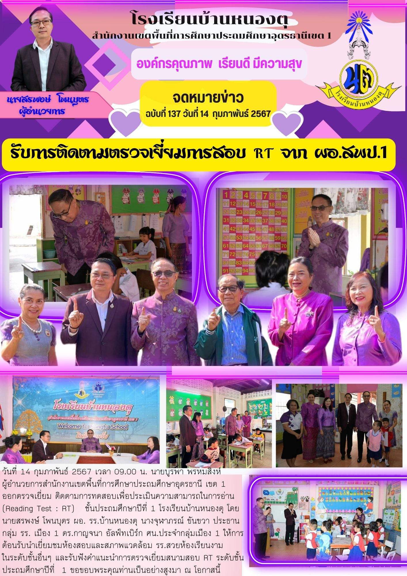 ผู้อำนวยการสำนักงานเขตพื้นที่การศึกษาประถมศึกษาอุดรธานีเขต 1 ออกติดตาม ตรวจเยี่ยม การทดสอบเพื่อประเมินความรู้ด้านการอ่าน RT ชั้นประถมศึกษาปีที่ 1 ณ.โรงเรียนบ้านหนองตุ จังหวัดอุดรธานี