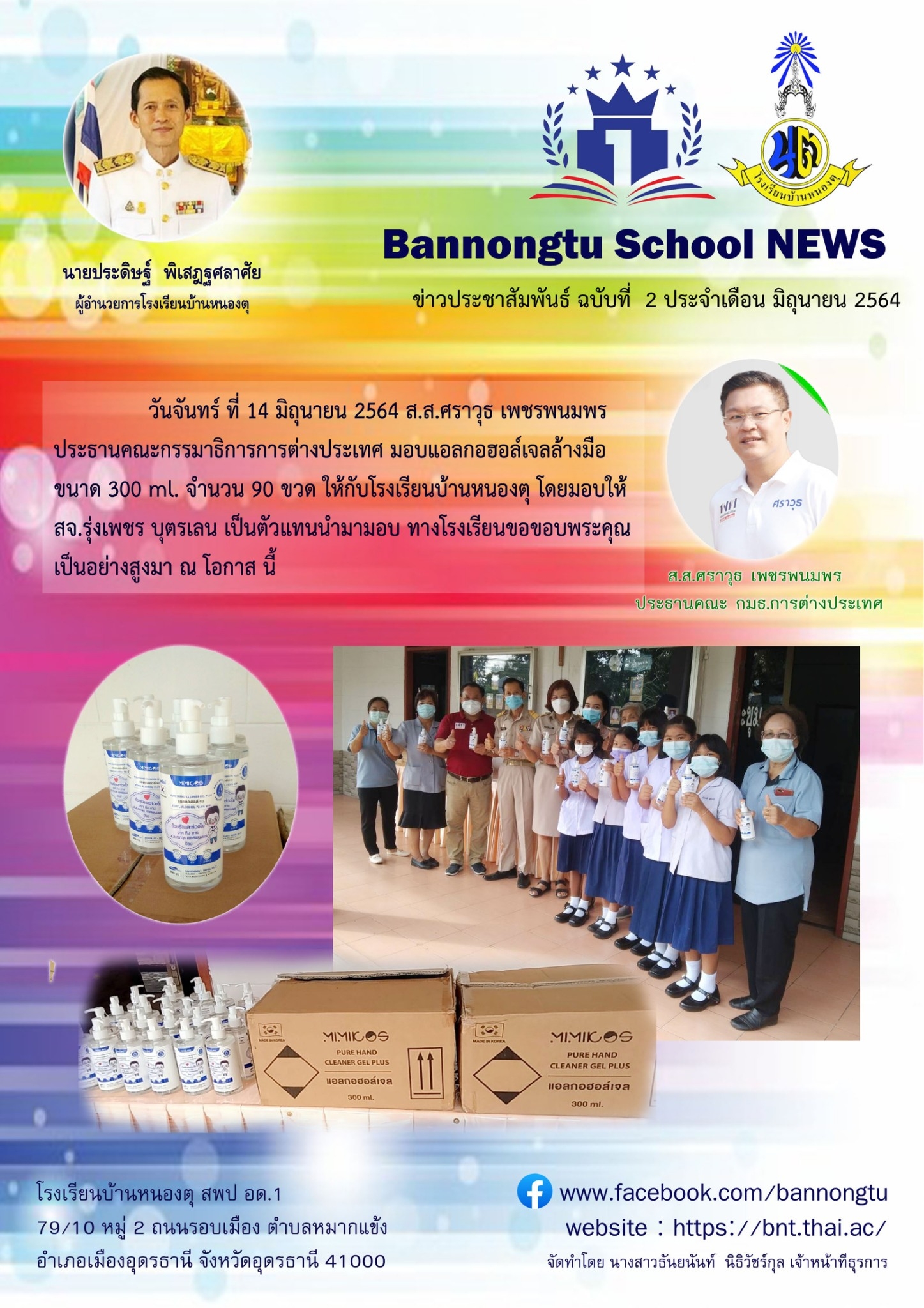 ส.ส.ศราวุธ เพชรพนมพร ประธานคณะกรรมาธิการการต่างประเทศ มอบแอลกอฮอล์เจลล้างมือให้กับโรงเรียนบ้านหนองตุ