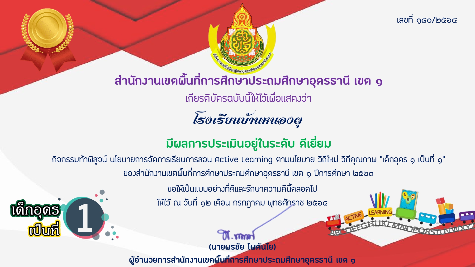 การประเมินตามนโยบาย วิถีใหม่ วิถีคุณภาพ "เด็กอุดร 1 เป็นที่ 1" การจัดการเรียนการสอน Active Learning อยู่ในระดับ ดีเยี่ยม